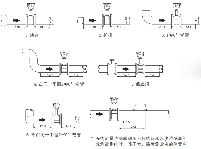 提示:常規(guī)情況下流量計均遵循前10后5原則(既:流量計前方最少要有10*D(D為流量計內(nèi)徑)長度的直管段,后方要有5*D長度的直管段。
